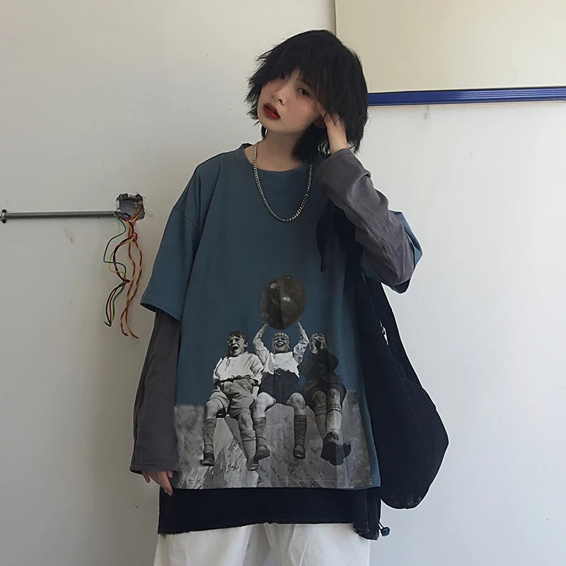 Woherb Harajuku Clothing Streetwear T-shirt for Women Men Korean Ulzzang Vintage Childhood Fake 2 P